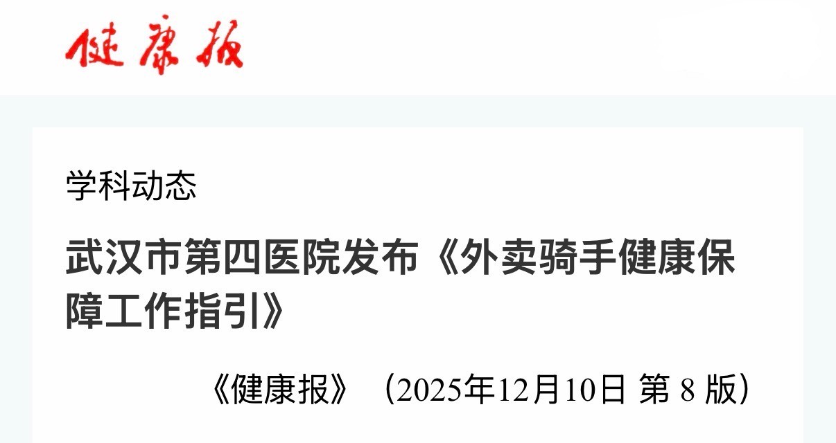 打造骑手健康的“武汉样本”,我院发布《外卖骑手健康保障工作指引》 11月14日上午,武汉市第四医院(湖北省运动医学中心)联合省市多部门在硚口区汉江湾体育公园举行“文明交通·健康联盟”宣传倡议活动。继推出骑手门诊后,该院又发布了全国首个《外卖骑手健康保障工作指引》,结合专业的医疗知识,为骑手群体的健康再添保障。   活动在武汉市委宣传部、武汉市公安交管局、武汉市市场监督管理局、武汉市卫生健康委员会的指导下,由武汉市第四医院(湖北省运动医学中心)和硚口区委宣传部(区文明办)联合主办。来自湖北省慈善总会、外卖平台企业淘宝闪购、以及爱心企业、文明实践志愿者和外卖骑手的代表共同参加活动。 &nb