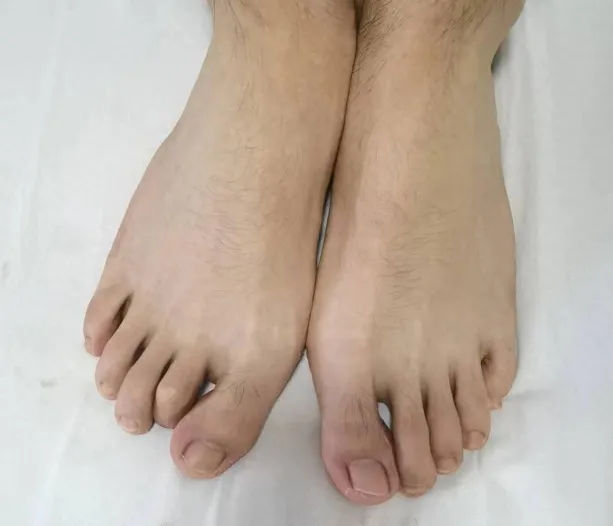 卷屈趾一般影响第二到第五脚趾, 外观来看脚趾是勾起来、交叠在一起会往内侧倾斜同时有旋转。 潘昊介绍,卷屈趾在孩童时期一般来说没什么不舒服,但成年之后会像小陈一样遇到穿鞋挤压脚趾,造成脚趾长出老茧甚至水泡的情况。由于患者脚趾畸形已严重影响到日常生活,建议进行手术矫正。